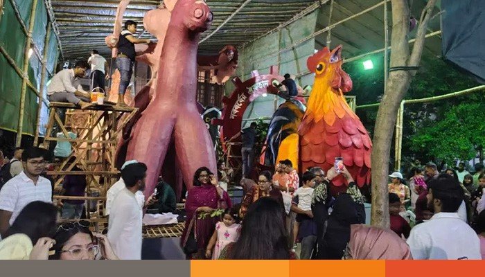 সরেজমিনে দেখা গেছে, শোভাযাত্রার জন্য তৈরি প্রধান পাঁচটি মোটিফে তখনও রঙের কাজ চলছিল। আয়োজকরা জানান, রাতের মধ্যেই সব প্রস্তুতি সম্পন্ন হবে। চারুকলার বকুলতলায় বিকেল ৪টা থেকে শুরু হওয়া সাংস্কৃতিক অনুষ্ঠানও দর্শনার্থীদের আকর্ষণের কেন্দ্র হয়ে ওঠে। সেখানে লোকসংগীত, নৃত্য ও শিল্পচর্চার নানা পরিবেশনা চলে।