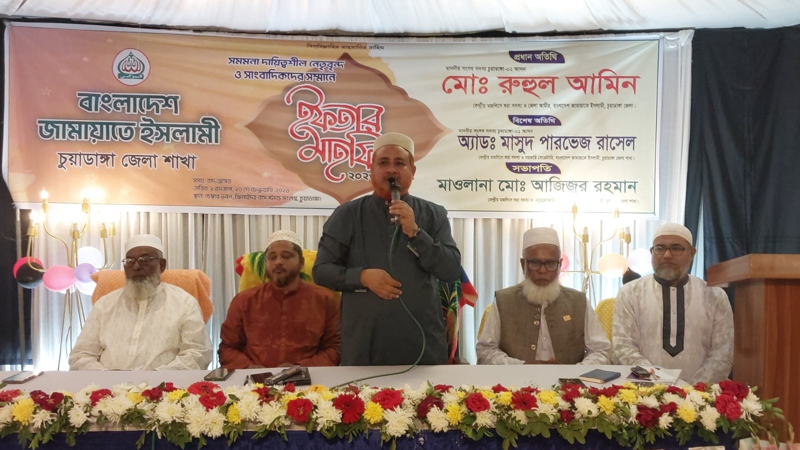 জেলা জামায়াতের নায়েবে আমির মাওলানা আজিজুর রহমানের সভাপতিত্বে ও সহকারি সেক্রেটারি আব্দুল কাদেরের উপস্থাপনায় অনুষ্ঠিত ইফতার মাহফিলে প্রধান অতিথি হিসেবে উপস্থিত ছিলেন চুয়াডাঙ্গা-২ আসনের সংসদ সদস্য ও চুয়াডাঙ্গা জেলা জামায়াতের আমির রুহুল আমিন। বিশেষ অতিথি হিসেবে উপস্থিত ছিলেন, চুয়াডাঙ্গা-১ আসনের সংসদ সদস্য অ্যাডভোকেট মাসুদ পারভেজ রাসেল।