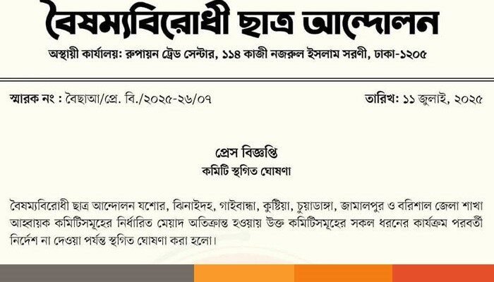 লিখিত বিজ্ঞপ্তিতে বলা হয়, সংগঠনের যশোর, ঝিনাইদহ, গাইবান্ধা, কুষ্টিয়া, চুয়াডাঙ্গা ও বরিশাল জেলা শাখা এবং সংশ্লিষ্ট উপজেলা আহ্বায়ক কমিটিগুলোর নির্ধারিত মেয়াদ অতিক্রান্ত হওয়ায় পরবর্তী নির্দেশ না দেওয়া পর্যন্ত এসব কমিটির সকল কার্যক্রম স্থগিত থাকবে।