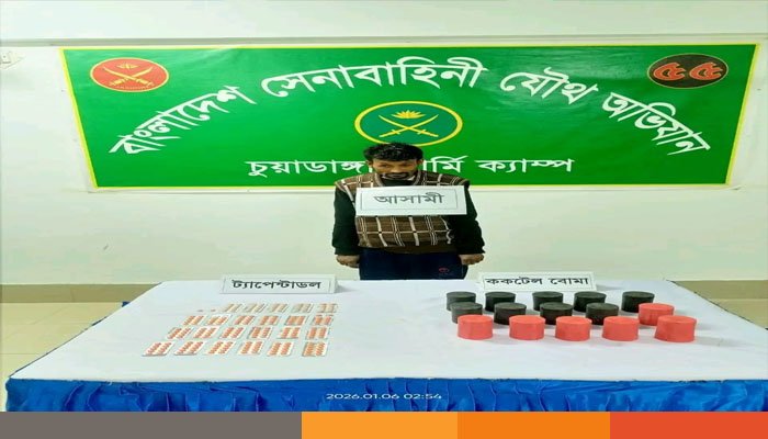 চুয়াডাঙ্গায় ১৫টি ককটেল বোমা ও ২৩০ পিচ ট্যাপেন্ডা ট্যাবলেট (মাদকদ্রব্য) উদ্ধার করেছে যৌথ বাহিনী। এ ঘটনায় জড়িত এরিন বাদশা (৪০) নামে একজনকে আটক করা হয়।