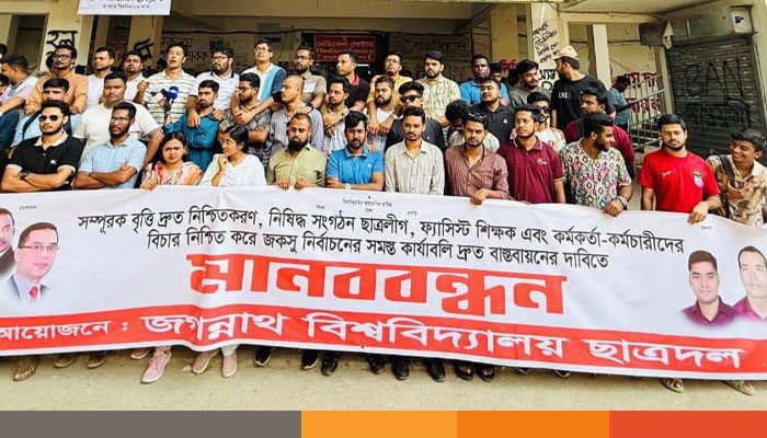 সোমবার (২৫ আগস্ট) বিশ্ববিদ্যালয়ের ভাষা শহীদ রফিক ভবনের সামনে এই মানববন্ধন কর্মসূচি অনুষ্ঠিত হয়। মানববন্ধনে দাবি তিনটি হলো, মন্ত্রণালয়ের আশ্বাস মোতাবেক শিক্ষার্থীদের জন্য ৭০% আবাসন ভাতা প্রদান বাস্তবায়ন করা, ফ্যাসিস্ট ছাত্রলীগের নেতাকর্মী ও আওয়ামী শিক্ষক-কর্মকর্তাদের বিচারের আওতায় আনা এবং দ্রুত জকসুর নীতিমালা প্রনয়নসহ সকল কর্যক্রম শেষ করা।
