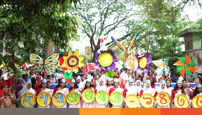 এরপর সকাল ৯টায় উপাচার্যের নেতৃত্বে বর্ণাঢ্য বৈশাখী শোভাযাত্রা ক্যাম্পাস থেকে শুরু হয়ে রায়সাহেব বাজার ও ভিক্টোরিয়া পার্ক প্রদক্ষিণ করে পুনরায় ক্যাম্পাসে এসে শেষ হয়। শোভাযাত্রায় অংশ নেন ঢাকা-৭ আসনের সংসদ সদস্য হামিদুর রহমান হামিদ, ট্রেজারার অধ্যাপক ড. সাবিনা শরমীনসহ শিক্ষক, শিক্ষার্থী, কর্মকর্তা-কর্মচারী ও বিভিন্ন সাংস্কৃতিক সংগঠনের সদস্যরা। চারুকলা অনুষদের আয়োজনে শোভাযাত্রায় পায়রা, পাখি, চরকি, সূর্যমুখী ও ফড়িংসহ নান্দনিক উপস্থাপনা বিশেষ আকর্ষণ হয়ে ওঠে।