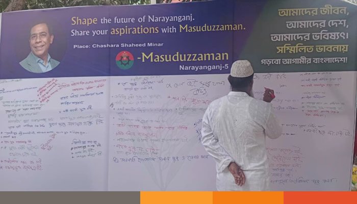 নারায়ণগঞ্জ ৫ আসনের এমপি প্রার্থী মাসুদুজ্জামানের ২ ডিসেম্বর এই উদ্যোগের মাধ্যমে সর্বস্তরের সাধারণ মানুষ তাদের দৈনন্দিন সমস্যা, প্রয়োজন, প্রত্যাশা এবং স্থানীয় উন্নয়ন সম্পর্কে মতামত লিখে সরাসরি জানাতে শুরু করেন।কর্মসূচিটি ধারাবাহিকভাবে নারায়ণগঞ্জ–৫ আসনের বিভিন্ন স্থানে আয়োজন করা হবে, যাতে সকল শ্রেণি-পেশার নাগরিক তাদের নিজস্ব মতামত প্রকাশ করতে পারেন।