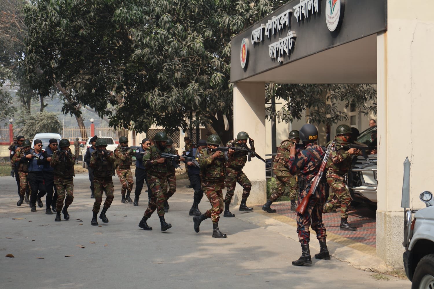 মহড়ায় ভোটগ্রহণ চলাকালীন সময়ে যেকোনো সহিংসতা বা অপ্রীতিকর ঘটনা ঘটলে যৌথবাহিনী কীভাবে দ্রুত সাড়া দেবে এবং সমন্বিতভাবে পরিস্থিতি নিয়ন্ত্রণে আনবে, তার কৌশল প্রদর্শন করা হয়।