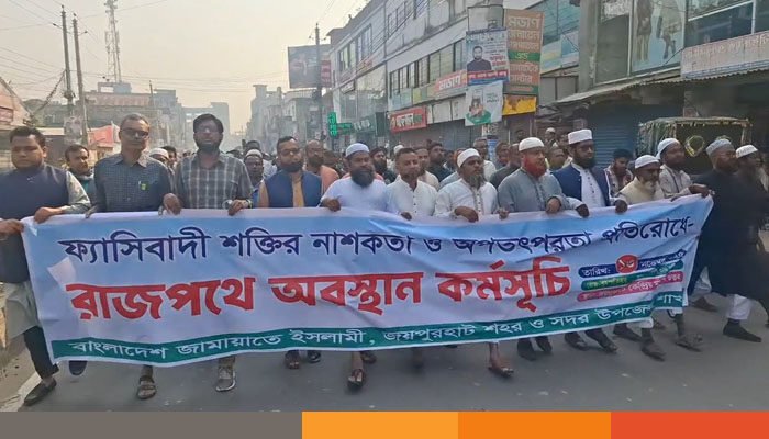 ফ্যাসিবাদী শক্তির নাশকতা ও অপতৎপরতা প্রতিরোধে জয়পুরহাটে জামায়াতের বিক্ষোভ মিছিল ও অবস্থান কর্মসূচী পালন করে।
