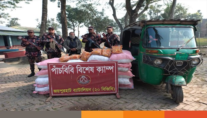 বিজিবি জানায়, ২০-বিজিবি জয়পুরহাট ব্যাটালিয়নের পাঁচবিবি বিশেষ ক্যাম্পের কাটা চেকপোস্ট হাবিলদার শাহ আলমের নেতৃত্বে একটি টহল দল তল্লাশি অভিযান পরিচালনা করছিল। এ সময় একটি মহেন্দ্র অটো গাড়িতে তল্লাশি চালিয়ে বিএসটিআই অনুমোদনহীন ১৯টি সাদা বস্তায় ৩৭০ প্যাকেট এবং ৯টি পলি বস্তায় ৪০ কেজি খোলা চানাচুর জব্দ করা হয়। জব্দকৃত মোট ৪১০ কেজি চানাচুরের বাজারমূল্য প্রায় ৪৯ হাজার ২০০ টাকা। পণ্যগুলো পরিবহনে ব্যবহৃত ৫ লাখ টাকা মূল্যের মহেন্দ্র অটো গাড়িটিও জব্দ করা হয়েছে।