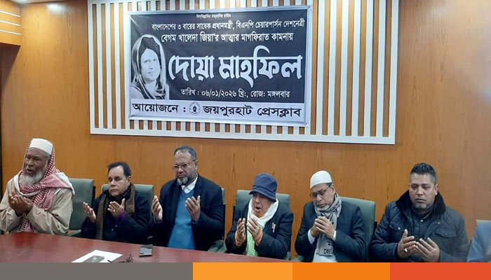 প্রয়াত সাবেক তিনবারের প্রধানমন্ত্রী ও বিএনপির চেয়ারপারসন বেগম খালেদা জিয়ার রুহের মাগফিরাত কামনায় জয়পুরহাটে দোয়া মাহফিল অনুষ্ঠিত হয়েছে। মঙ্গলবার দুপুরে জয়পুরহাট প্রেসক্লাবের সভাকক্ষে প্রেসক্লাবের আয়োজনে এ দোয়া মাহফিল অনুষ্ঠিত হয়। এতে সভাপতিত্ব করেন জয়পুরহাট প্রেসক্লাবের সভাপতি আবুবকর সিদ্দিক।