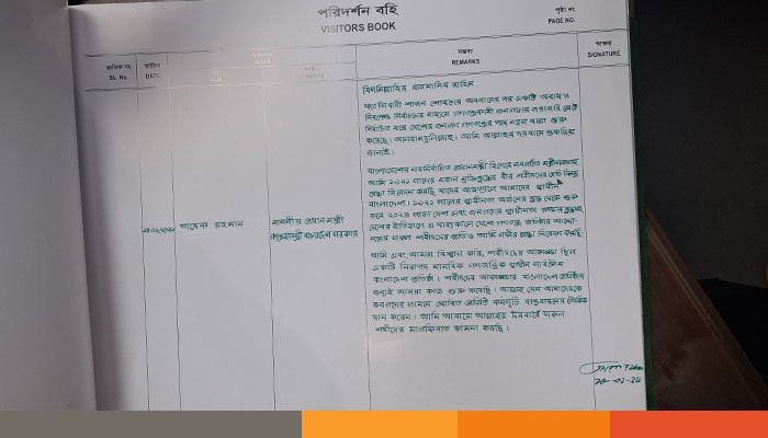 পরিদর্শন বইয়ে তিনি লিখেছেন-