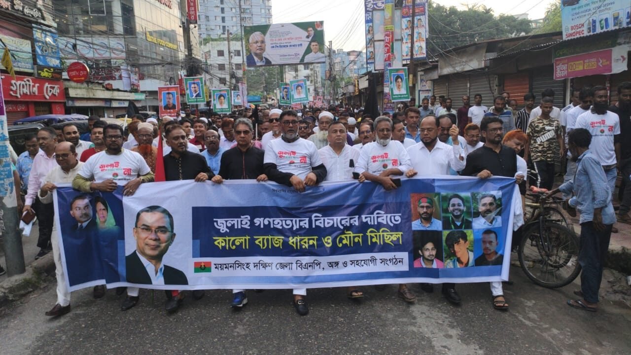জুলাই গণহত্যার বিচারের দাবিতে ময়মনসিংহ দক্ষিণ জেলা মহানগর বিএনপি ও অঙ্গ সংগঠনের উদ্যোগে কালো ব্যাজ ধারণ ও মৌন মিছিল টাউন হল মোড় হতে শহরের প্রধান প্রধান সড়ক প্রদক্ষিণ করে দলীয় কার্যালয়ে গিয়ে শেষ হয়।