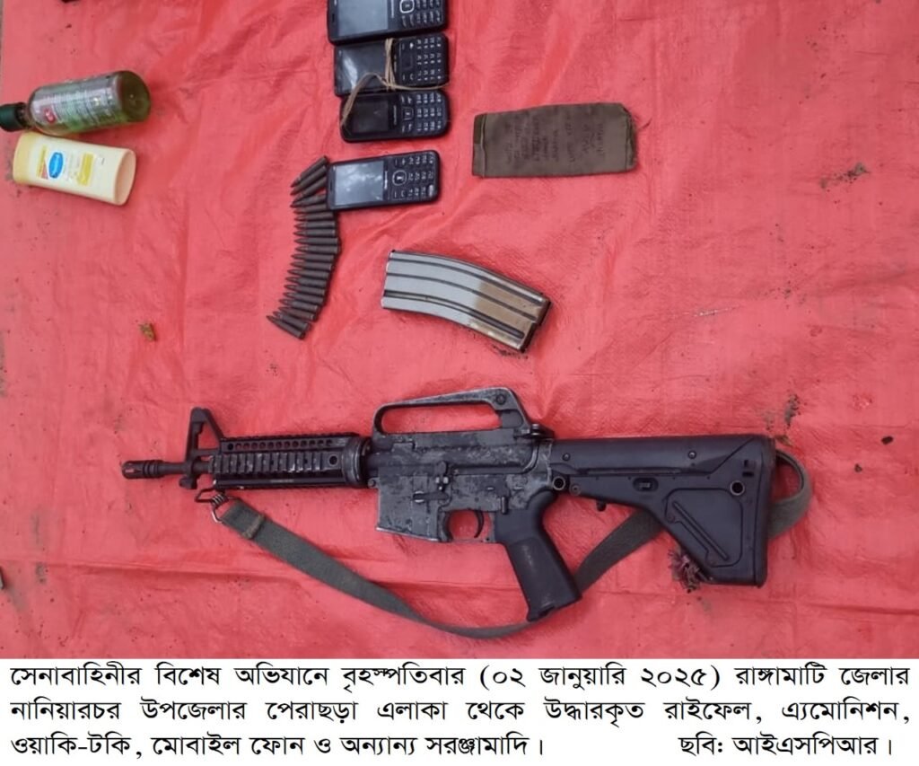 আজ ২ জানুয়ারি ২০২৫ তারিখ বেলা সাড়ে পাঁচটায় গোয়েন্দা তথ্যের ভিত্তিতে পার্বত্য চট্টগ্রামের রাঙ্গামাটি জেলার নানিয়ারচর উপজেলার পেরাছড়া এলাকায় একটি বিশেষ অভিযান পরিচালনা করে বাংলাদেশ সেনাবাহিনী।