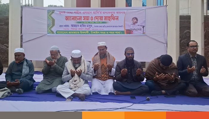 ইনকিলাব মঞ্চের মুখপাত্র শহীদ শরিফ ওসমান হাদির মাগফিরাত কামনায় টাঙ্গাইলে আলোচনা সভা ও দোয়া মাহফিল অনুষ্ঠিত হয়েছে। শনিবার বিকেল টাঙ্গাইল শহরের শহীদ মিনারে বাংলাদেশ জামায়াতে ইসলামী টাঙ্গাইল শহর ও সদর উপজেলা শাখার উদ্যোগে এ দোয়া মাহফিল অনুষ্ঠিত হয়।