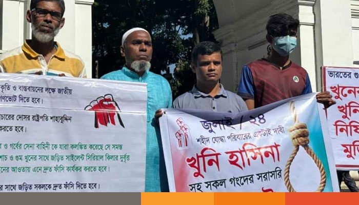 সোমবার (১৭ নভেম্বর) সকাল সাড়ে ১০টার দিকে প্রথমে তারা ট্রাইব্যুনালের মূল ফটকের সামনে অবস্থান নেন। এরপর তারা হাইকোর্টের মাজার রোড সংলগ্ন গেটের সামনে অবস্থান নেন।