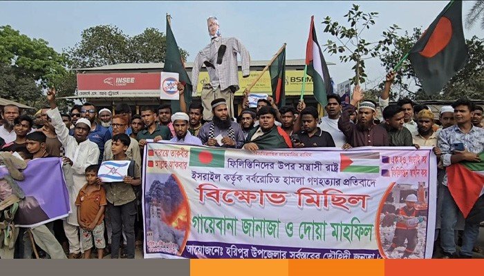 ফিলিস্তিনের গাজা উপত্তকায় ইসরায়েলের গণহত্যা ও দখলদারিত্বের প্রতিবাদে ঠাকুরগাঁওয়ের হরিপুরে বিক্ষোভ করেছেন সর্বস্তরের তৌহিদী জনতা।