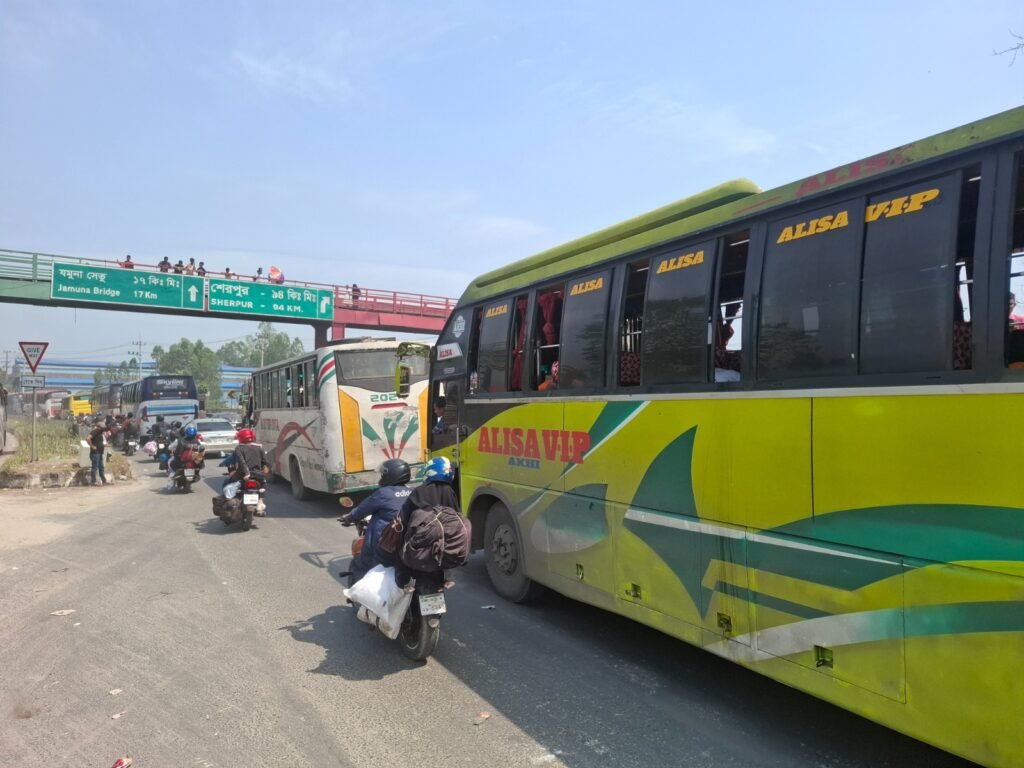 পুলিশ ও সেতু কর্তৃপক্ষ জানায়, মহাসড়কে দীর্ঘ যানবাহনের কারণে যমুনা সেতু দিয়ে সকাল ১১টা ৪০ মিনিট থেকে দুপুর ১টা ১৬ মিনিট পর্যন্ত শুধুমাত্র উত্তরবঙ্গগামী যানবাহন চলাচল করে। এসময় ঢাকাগামী যানবাহন বন্ধ থাকে। গতকাল বুধবার রাত থেকে বৃহস্পতিবার দুপুর পর্যন্ত যমুনা সেতুর উপর প্রায় ১৭ টি গাড়ি বিকল ও স্টার্ট বন্ধ হয়ে যায় এছাড়া সেতুর উপরে গাড়ি থামিয়ে অনেকেই ঝগড়া করেছে। এর ফলে মহাসড়কের যানবাহনের দীর্ঘ সাড়ির তৈরি হয়েছে।