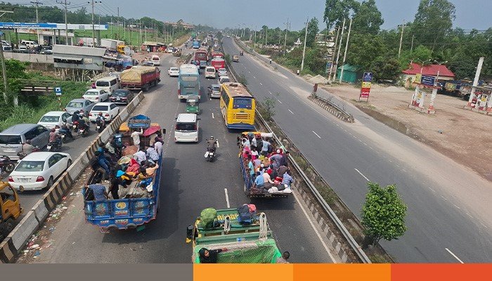 বৃহস্পতিবার সকাল থেকে দুপুর পর্যন্ত মহাসড়কের বিভিন্ন এলাকায় ঘুরে দেখা যায়, মহাসড়কে মানুষের ব্যাপক চাপ রয়েছে। থেকে থেকে যানবাহন চলছে। পরিবহন সংকট ও অতিরিক্ত ভাড়ার কারণে অনেক যাত্রী জীবনের ঝুঁকি নিয়ে খোলা ট্রাক ও পিকআপে যাতায়াত করছেন। এছাড়া কেউ কেউ ভাড়ায় চালিত প্রাইভেটকার ও নিজস্ব মোটরসাইকেলেও গন্তব্যে রওনা দিচ্ছেন। যানজট নিরসলে পুলিশকে বিভিন্নস্থানে দায়িত্ব পালন করতে দেখা যায়।
