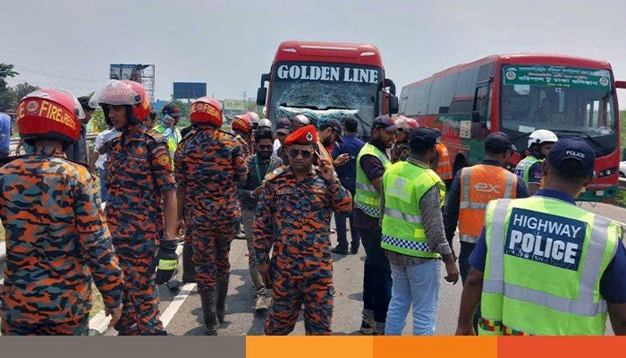 এদিকে, গোল্ডেন লাইন পরিবহনের বাসটির হেলপার সাইফুল ইসলাম শান্ত জানান, তারা কুষ্টিয়া থেকে যাত্রীবোঝাই বাস নিয়ে ঢাকার আব্দুল্লাহপুর এলাকায় আসছিলেন। নীমতলা এলাকায় এক্সপ্রেসওয়ের ডান পাশের লেনে দাঁড় করানো ছিল অ্যাম্বুলেন্সটি। তখন দ্রুতগতির বাসটি চালক ফয়সাল (৪০) ব্রেক করেও থামাতে পারেনি। সজোরে গিয়ে ধাক্কা লাগে থেমে থাকা অ্যাম্বুলেন্সের পেছনে।