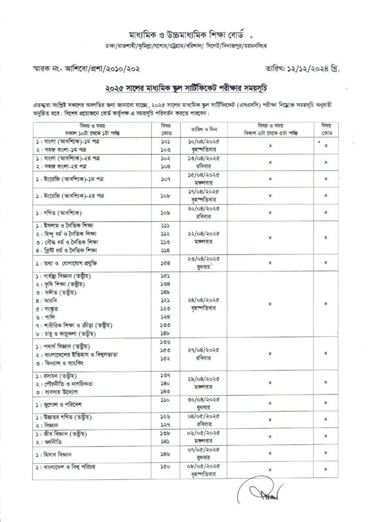 ২০২৫ সালের এসএসসি ও সমমানের পরীক্ষার তারিখ ঘোষণা করা হয়েছে। প্রকাশিত রুটিন অনুযায়ী আগামী বছরের ১০ এপ্রিল থেকে পরীক্ষা শুরু হবে। বাংলা প্রথম পত্র পরীক্ষার মাধ্যমে এসএসসি পরীক্ষা শুরু হবে। লিখিত পরীক্ষা শেষ হবে ৮ মে।