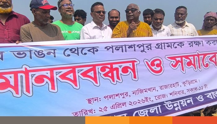 তিস্তা নদীর ভাঙনে বসতভিটা ও আবাদি জমি হারানো ক্ষতিগ্রস্তদের ক্ষতিপূরণ এবং কুড়িগ্রামের রাজারহাট উপজেলার নাজিমখান ইউনিয়নের পলাশপুর গ্রাম রক্ষার দাবিতে মানববন্ধন ও সমাবেশ করেছেন এলাকাবাসী।