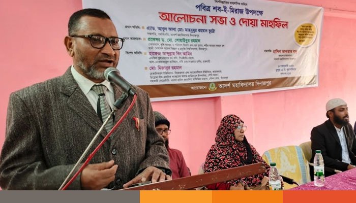 দিনাজপুরে আদর্শ মহাবিদ্যালয়ের আয়োজনে প্রতিষ্ঠানের হল রুমে ১৫ জানুয়ারি ২০২৬ বৃহস্পতিবার সকালে পবিত্র শব -ই- মিরাজ উপলক্ষ্যে আলোচনা সভা ও দোয়া মাহফিল অনুষ্ঠিত হয়েছে।
