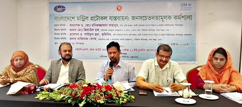 বাংলাদেশে মন্ট্রিল প্রটোকল বাস্তবায়ন শীর্ষক জনসচেতনতামুলক কর্মশালা অনুষ্ঠিত হয়েছে। ২৬ অক্টোবর ২০২৫ রোববার সকাল থেকে দুপুর পর্যন্ত দিনাজপুর শহরের লিলি মোড়ে হোটেল গ্র্যান্ডনুর হল রুমে এইচসিএফসি ফেজ আউট ম্যানেজমেন্ট প্ল্যান(স্টেজ-২) ইউএনইপি কম্পোনেন্ট প্রকল্প পরিবেশ অধিদপ্তর, পরিবেশ-বন ও জলবায়ু পরিবর্তন মন্ত্রণালয়ের আয়োজনে এই কর্মশালা অনুষ্ঠিত হয়।
