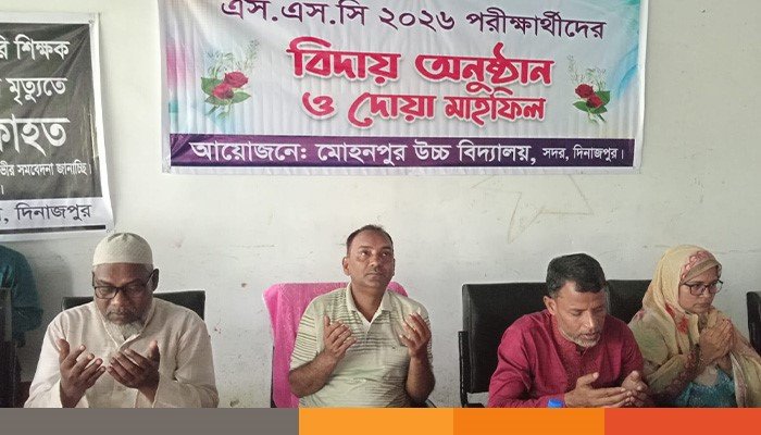 দিনাজপুর সদর উপজেলার ৬নং আউলিয়াপুর ইউনিয়নের মোহনপুর উচ্চ বিদ্যালয়ে এসএসসি পরীক্ষার্থীদের বিদায় ও বিদ্যালয়ের সিনিয়র শিক্ষক সাইদুল ইসলাম খানের অকাল মৃত্যুতে দোয়া-মাহফিল অনুষ্ঠিত হয়েছে।
