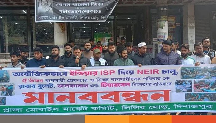 দিনাজপুর শহরের প্রাণকেন্দ্র লিলি মোড়স্থ সমতা প্লাজা মোবাইল মার্কেট কমিটির উদ্যোগে অযৌক্তিকভাবে ভারতের আইএসপি দিয়ে এনইআইআর চালু, ৫৬ জন মোবাইল ব্যবসায়ীকে গ্রেফতার এবং নিরস্ত্র ব্যবসায়ী ও তাদের পরিবারের ওপর রাবার বুলেট, জলকামান ও টিয়ারসেল নিক্ষেপের প্রতিবাদে এ মানববন্ধন কর্মসূচি পালিত হয়েছে।