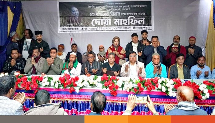 গণপ্রজাতন্ত্রী বাংলাদেশ সরকারের সাবেক প্রধানমন্ত্রী, দেশনেত্রী বিএনপি’র চেয়ারপারসন বেগম খালেদা জিয়ার মৃত্যুতে তার রুহের মাগফেরাত কামনায় দিনাজপুর পৌর বিএনপির অন্তর্গত ৩ নং ওয়ার্ডের আয়োজনে ১৭ জানুয়ারি-২০২৬ শনিবার বিকেলে শহরের মুন্সিপাড়া হেমায়েত আলী হল প্রাঙ্গনে দোয়া মাহফিল অনুষ্ঠিত হয়।