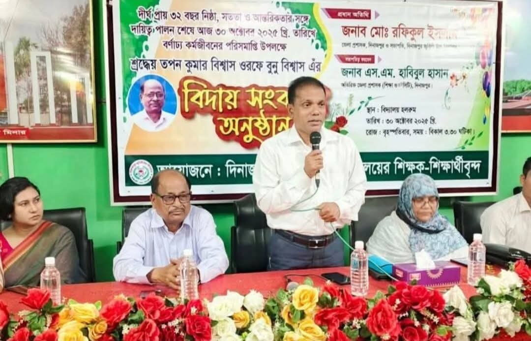 দিনাজপুর জুবিলী উচ্চ বিদ্যালয়ের প্রধান শিক্ষক তপন কুমার বিশ্বাস (বুনু বিশ্বাস) -এর বিদায় ও সংবর্ধনা অনুষ্ঠিত হয়েছে। অত্র বিদ্যালয়ের প্রধান শিক্ষক বুনু বিশ্বাস দীর্ঘ ৩২ বছর ধরে নিষ্ঠার সাথে তার দায়িত্ব পালন করে আসছেন।