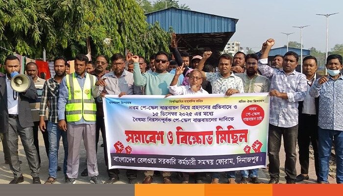 বাংলাদেশ রেলওয়ে সরকারি কর্মচারী সমন্বয় ফোরাম, দিনাজপুর-এর উদ্যোগে (২৯ নভেম্বর ২০২৫ শনিবার) দিনাজপুর রেলওয়ে প্লাটফর্মে ৯ম পে-স্কেল বাস্তবায়ন ও বৈষম্য নিরসনের দাবিতে সমাবেশ ও বিক্ষোভ মিছিল অনুষ্ঠিত হয়েছে। কেন্দ্রীয় কর্মসূচির অংশ হিসেবে এই কর্মসূচি পালিত হয়।