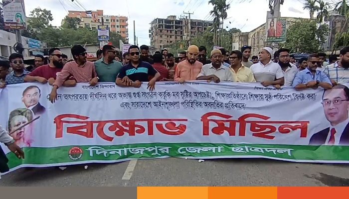 গোপন তৎপরতায় দীর্ঘদিন ধরে অভ্যস্ত গুপ্ত সংগঠন কতৃক মব সৃষ্টির অপচেষ্টা, শিক্ষাপ্রতিষ্ঠানে শিক্ষার সুষ্ঠু পরিবেশ বিনষ্ট করা এবং সারাদেশে আইনশৃঙ্খলা পরিস্থিতির অবনতির প্রতিবাদে দিনাজপুরে বিক্ষোভ মিছিল অনুষ্ঠিত হয়েছে।