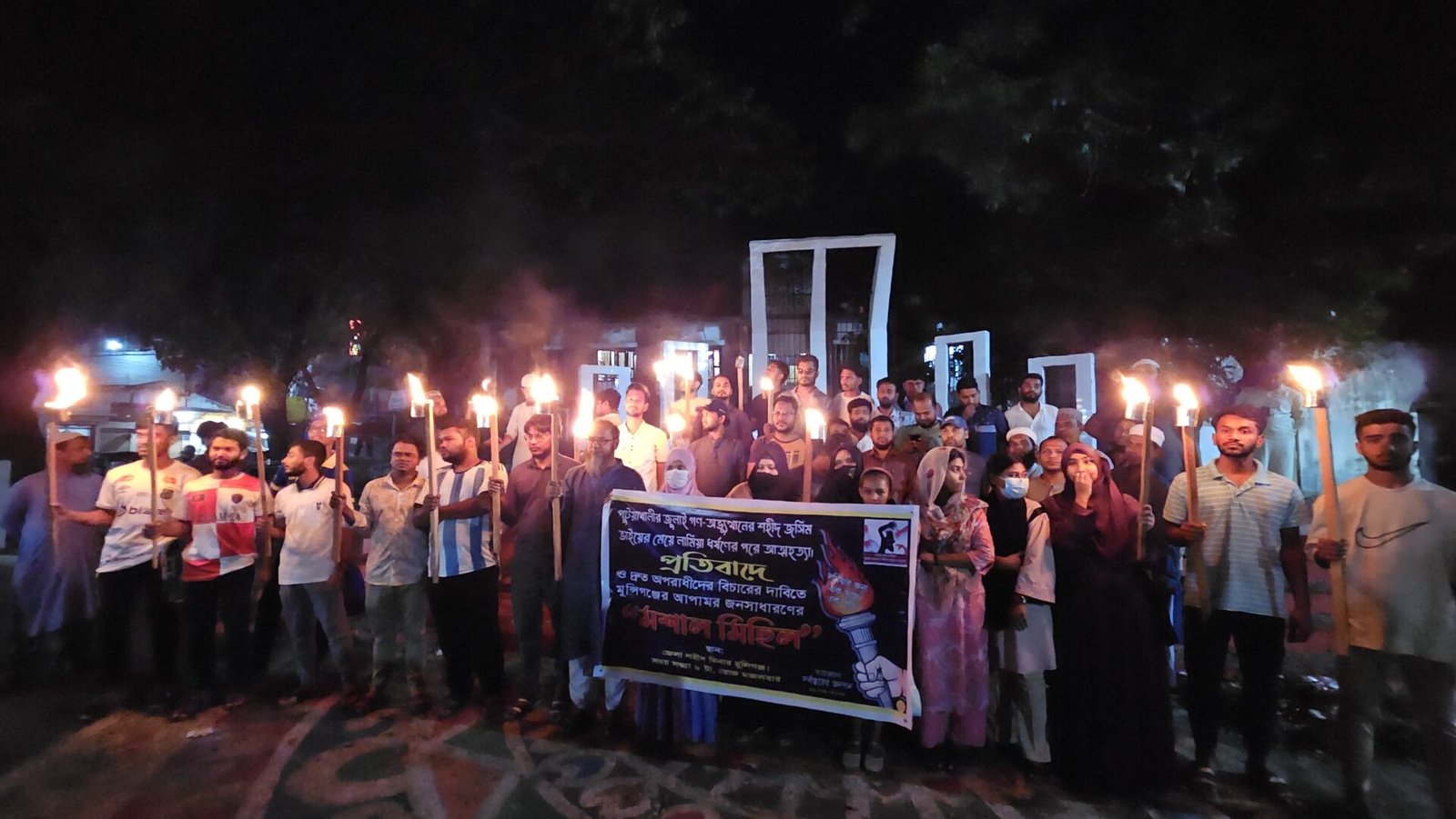 পটুয়াখালীতে ধর্ষণের শিকারের পর জুলাই শহীদের জসিম উদ্দিনের মেয়ে আত্মহত্যার ঘটনায় ধর্ষণকারীদের দ্রুত বিচারের দাবিতে মুন্সীগঞ্জে মশাল মিছিল করা হয়েছে। মঙ্গলবার সন্ধ্যায় ৭টার দিকে সর্বস্তরের জনগনের ব্যানারে জেলার কেন্দ্রীয় শহীদ মিনার থেকে মিছিলটি বের হয়। এতে অংশ নেয় বিভিন্ন বয়সী শতাধিক ছাত্র জনতা।