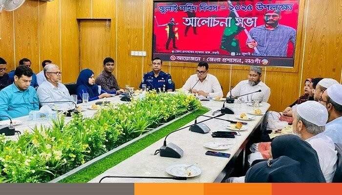 নওগাঁয় জুলাই শহীদ দিবস ২০২৫ পালনের অংশ হিসেবে জেলা প্রশাসনের আয়োজনে আলোচনা সভা অনুষ্ঠিত হয়েছে।