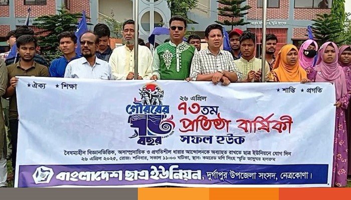 নানা আয়োজনের মধ্য দিয়ে নেত্রকোনার দুর্গাপুর উপজেলায় ছাত্র ইউনিয়নের প্রতিষ্ঠাবার্ষিকী পালিত হয়েছে। দীর্ঘ লড়াই-সংগ্রাম পার করে ঐতিহ্যবাহী এই সংগঠনটির ৭৩তম প্রতিষ্ঠাবার্ষিকী।