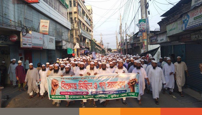 হেফাজতে ইসলাম কুষ্টিয়া জেলা শাখার সভাপতি মুফতি আব্দুল হামিদের সভাপতিত্বে সমাবেশে বক্তব্য রাখেন সাধারণ সম্পাদক মাওঃ আব্দুল খালেক, সিনিয়র সহ-সভাপতি মাওঃ শামসুল হক, সহ-সভাপতি মাওঃ আব্দুর রউফ, যুগ্ম সাধারণ সম্পাদক মাওঃ আব্দুল লতিফ খান প্রমুখ।