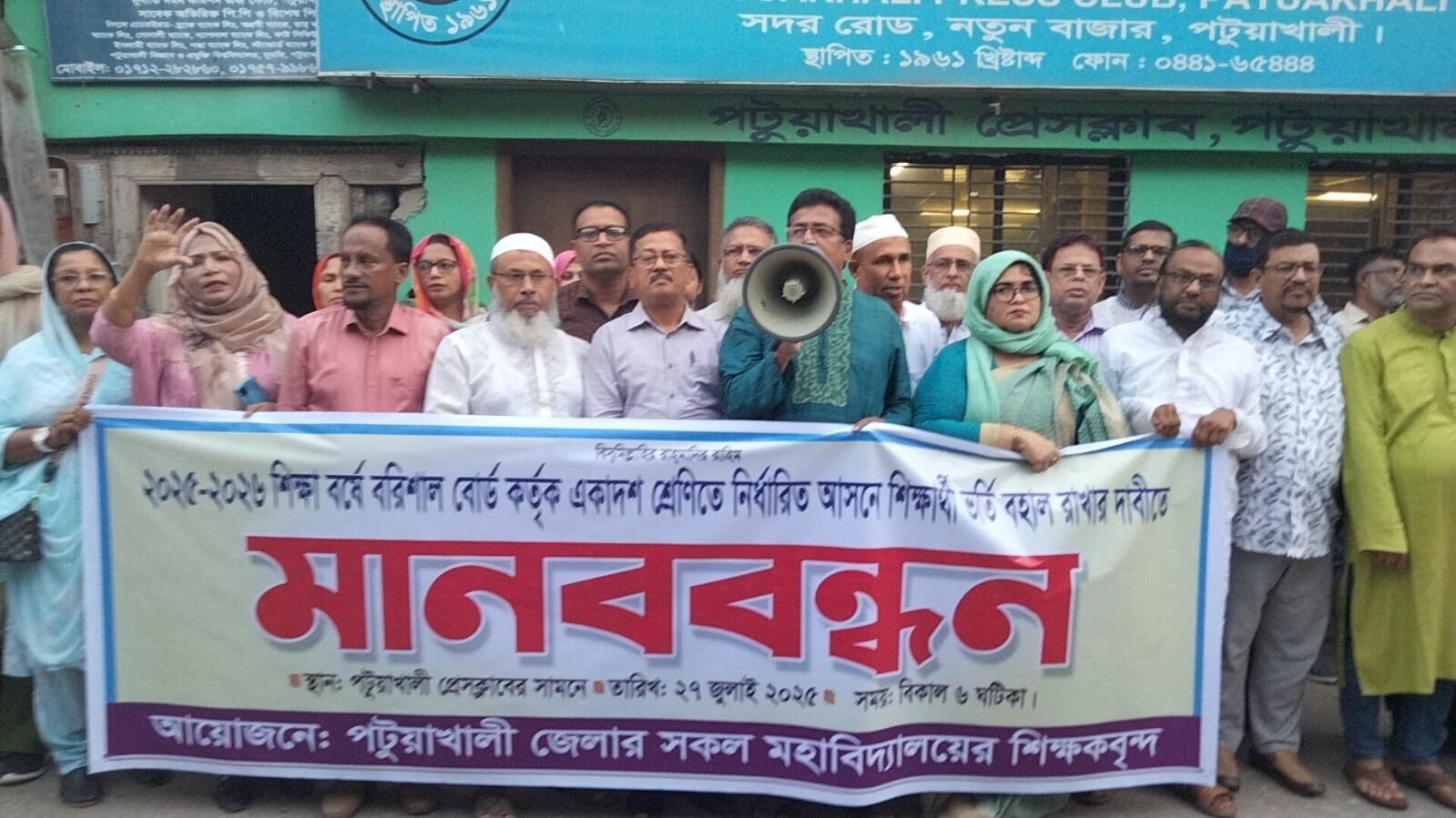 ২০২৫-২৬ শিক্ষা বর্ষে বরিশাল বোর্ড কর্তৃক একাদশ শ্রেণিতে নির্ধারিত আসনে শিক্ষার্থী ভর্তি বহাল রাখার দাবীতে মানববন্ধন করেছে পটুয়াখালী জেলার সকল বেসরকারি কলেজের শিক্ষকবৃন্দ।