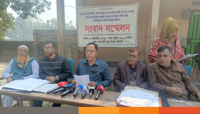 বৃহস্পতিবার (৫ ফেব্রুয়ারী) দুপুরে অধ্যক্ষের কার্যালয়ের সামনে এ সংবাদ সম্মেলন অনুষ্ঠিত হয়।গয়াবাড়ী স্কুল এন্ড কলেজের সহকারী অধ্যাপক কামরুজ্জামান লিখিত অভিযোগে বলেন,২০০৯ সালে প্রতিষ্ঠানের অধ্যক্ষ অবসরে গেলে তৎকালিন সময়ে গয়াবাবাড়ী ইউনিয়ন আওয়ামীলীগের সভাপতি আব্দুর রহিম এর ছেলে ফরহাদ হোসেন দলীয় প্রভাব দেখিয়ে অত্র প্রতিষ্ঠানের ভারপ্রাপ্ত অধ্যক্ষ হিসেবে নিয়োগ গ্রহণ করেন।দায়িত্ব গ্রহণের পর থেকে প্রতিষ্ঠানের কমিটি, অনিয়ম ও নিয়োগ বানিজ্যে ভরপুর ছিল। তবে ২০১১ সালে এডহক কমিটির ০৬ জন সদস্য দিনাজপুর শিক্ষা বোর্ড বরাবর লিখিত অভিযোগ করলেও পাইনি কোন সাড়া উল্টো প্রতিষ্ঠানের অবকাঠামো উন্নয়ন, একাডেমিক ও পাবলিক পরীক্ষার ফলাফল ধস নেমে আসে।২০২৪ সালে ছাত্রজনতার অভ্যুত্থানের পর অধ্যক্ষ ফরহাদ হোসেন সরকারের বিরুদ্ধে ১৪ টি অভিযোগ দায়ের করলে উপজেলা নির্বাহী কর্মকর্তা তদন্তের মাধ্যমে তাহাকে অব্যহতি প্রদান করে ওই প্রতিষ্ঠানের সহকারী অধ্যাপক (অর্থনীতি) কামরুজ্জামান দায়িত্বভার বুঝিয়ে দেওয়ার সুপারিশ দেন। কিন্তু এসব বিষয়ে মামলা দাখিল করলেও আদালতের পক্ষ থেকে আপিল হলেও ডিমলা উপজেলা নির্বাহী কর্মকর্তা পক্ষ থেকে কোন জারি হয়নি এমনকি নীলফামারী উপজেলা নির্বাহী কর্মকর্তা পক্ষ থেকে প্রতিষ্ঠান পরিচালনা করার লিখিত দলিল দেখে ২০১৭ সালে নিয়মিত কমিটির স্বাক্ষর জাল করে কোটি টাকার বিনিময়ে ০৮ জনকে নিয়োগ প্রদান করেন। তবে নিয়োগ প্রাপ্তদেরকে কখনো প্রতিষ্ঠানের হাজিরা খাতায় স্বাক্ষর দিতে দেখেনি কেউ এমন অভিযোগ তুলেন তিনি।