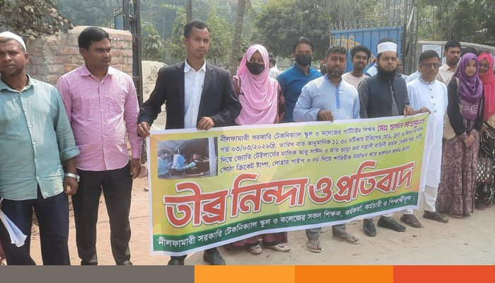 নীলফামারী সরকারী টেকনিক্যাল স্কুল ও কলেজের সকল শিক্ষক, কর্মকর্তা, কর্মচারী ও শিক্ষার্থীদের আয়োজনে বৃহস্পতিবার দুপুরে প্রতিষ্ঠানের সামনে তীব্র নিন্দা ও প্রতিবাদ সভা অনুষ্ঠিত হয়েছে।