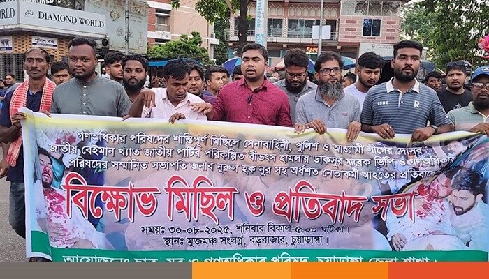 জাতীয় পার্টির হামলায় ডাকসুর সাবেক ভিপি ও গণঅধিকার পরিষদের সভাপতি নূরুল হক নূরসহ অর্ধশতাধিক নেতাকর্মী আহত হওয়ার ঘটনায় চুয়াডাঙ্গায় বিক্ষোভ মিছিল ও প্রতিবাদ সভা অনুষ্ঠিত হয়েছে। শনিবার (৩০ আগস্ট) বিকেল সাড়ে ৫টায় চুয়াডাঙ্গা জেলা শহরের বড়বাজার মুক্তমঞ্চ সংলগ্ন স্থানে জেলা ছাত্র, যুব ও গণঅধিকার পরিষদের উদ্যোগে এ কর্মসূচি পালিত হয়।