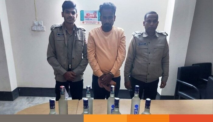 এসময় তার কাছ থেকে কফি রংয়ের একটি স্কুল ব্যাগের ভেতর পুরাতন কাপড় দিয়ে মোঁড়ানো ভারতের তৈরি ‘আইস ভদকা’ ব্র্যান্ডের সাদা রংয়ের কাচের আট বোতল মদ উদ্ধার করা হয়। পৌনে এক লিটার ওজনের এসব মদের অবৈধ বাজার মূল্য আনুমানিক ২৪ হাজার টাকা।