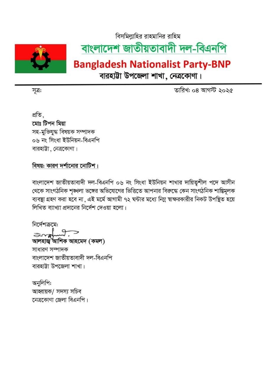 এরআগে গত সোমবার (৪ আগস্ট) টিপন মিয়াকে কারণ দর্শানোর (শোকজ) নোটিশ দেওয়া হয়। উপজেলা বিএনপির সাধারণ সম্পাদক আশিক আহমেদ কমল স্বাক্ষরিত ওই নোটিশে সাংগঠনিক শৃঙ্খলা ভঙ্গের অভিযোগে আগামী ৭২ ঘণ্টার মধ্যে টিপন মিয়াকে স্বশরীরে হাজির হয়ে লিখিত ব্যাখ্যা দিতে বলা হয়েছে।