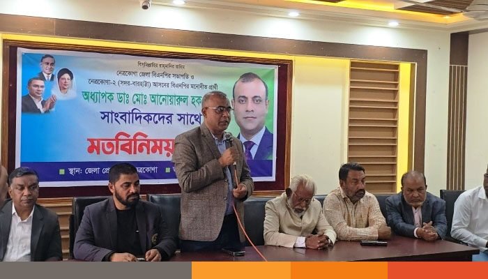 নেত্রকোনা জেলা প্রেসক্লাবে সাংবাদিকদের সাথে মতবিনিময় সভা করেছেন জেলা বিএনপির সভাপতি, নেত্রকোনা -২ (নেত্রকোনা- বারহাট্টা) আসনের বিএনপি মনোনীত প্রার্থী বিশিষ্ট অর্থোপেডিক্স চিকিৎসক অধ্যাপক ডা. মো. আনোয়ারুল হক।