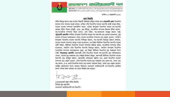 সোমবার (২ ফেব্রুয়ারি) দুপুরে বিএনপির সিনিয়র যুগ্ম মহাসচিব অ্যাডভোকেট রুহুল কবির রিজভী স্বাক্ষরিত এক বিজ্ঞপ্তিতে এই বহিষ্কারের সিদ্ধান্ত জানানো হয়। এতে বলা হয়, দলীয় সিদ্ধান্ত অমান্য করে সংগঠন বিরোধী কর্মকাণ্ডে জড়িত থাকার জন্য এ শাস্তিমূলক ব্যবস্থা গ্রহণ করা হয়েছে।