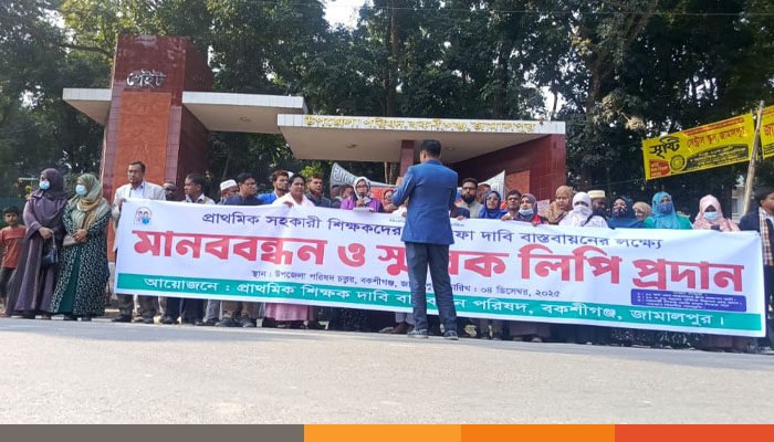 ন্যায্য অধিকারের দাবিতে বকশীগঞ্জে প্রাথমিক সহকারী শিক্ষকদের মানববন্ধন