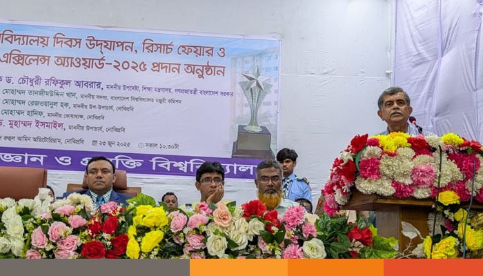 সোমবার (২৩ জুন) দুপুরের দিকে মুহাম্মদ রুহুল আমিন অডিটোরিয়ামে নোয়াখালী বিজ্ঞান ও প্রযুক্তি বিশ্ববিদ্যালয়ের (নোবিপ্রবি) ১৯তম বিশ্ববিদ্যালয় দিবস উদযাপন, রিসার্চ ফেয়ার এবং একাডেমিক এক্সিলেল অ্যাওয়ার্ড অনুষ্ঠানে প্রধান অতিথির বক্তব্যে তিনি এসব কথা বলেন অনুষ্ঠানে সভাপতিত্ব করেন বিশ্ববিদ্যালয়ের উপাচার্য অধ্যাপক ড. মুহাম্মদ ইসমাইল।