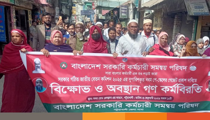 আসন্ন ত্রয়োদশ জাতীয় সংসদ নির্বাচন অনুষ্ঠানের আগেই সরকার গঠিত জাতীয় বেতন কমিশন ২০২৫ এর সুপারিশকৃত নবম পে-স্কলের গেজেট প্রকাশের দাবীতে পটুয়াখালীতে গণকর্ম বিরতি, মানববন্ধন ও বিক্ষোভ মিছিল করেছে ৪র্থ শ্রেনীর শত শত সরকারি কর্মচারিরা।
