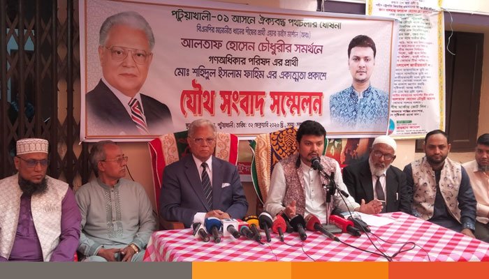 পটুয়াখালী-১ আসনে বিএনপির মনোনীত ধানের শীষের প্রার্থী এয়ার ভাইস মার্শাল (অবঃ) আলতাফ হোসেন চৌধুরীর সমর্থনে গণঅধিকার পরিষদ এর প্রার্থী মোঃ শহিদুল ইসলাম ফাহিম এর একাত্মতা প্রকাশে যৌথ সংবাদ সম্মেলন অনুষ্ঠিত।