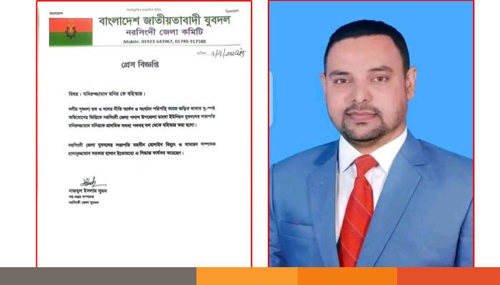 জেলা যুবদল সভাপতি মহসিন হোসেন বিদ্যুৎ বলেন, দলীয় আদর্শ ও শৃঙ্খলা সমুন্নত রাখতে পলাশ উপজেলার ডাঙ্গা ইউনিয়ন যুবদলের সভাপতি মনিরউজ্জামান মনিরকে দল থেকে বহিষ্কার করা হয়েছে।