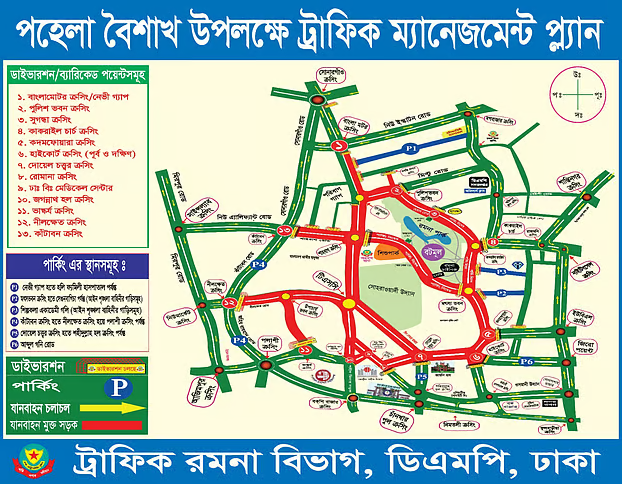 বাংলা নববর্ষ ১৪৩২ উদযাপন উপলক্ষে আগামী ১৪ এপ্রিল (রোববার) ঢাকায় যান চলাচল নিয়ন্ত্রণে বিশেষ ব্যবস্থা নিয়েছে ঢাকা মহানগর পুলিশ (ডিএমপি)। সোহরাওয়ার্দী উদ্যান, রমনা পার্ক, ঢাকা বিশ্ববিদ্যালয় এলাকা ও আশপাশের এলাকায় উৎসবমুখর পরিবেশ নিশ্চিতে সকাল ৫টা থেকে কয়েকটি গুরুত্বপূর্ণ সড়ক বন্ধ ও রোড ডাইভারশন কার্যকর থাকবে।