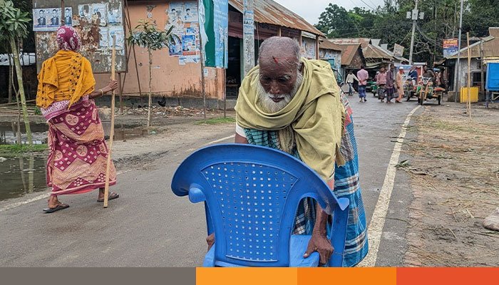 প্লাস্টিকের একটি চেয়ারে ভর দিয়ে কষ্টে কষ্টে হাঁটছেন ষাটোর্ধ্ব হুরমুজ আলী। শরীর ভাঙাচোরা, তবুও জীবনের তাগিদে থেমে নেই তার পথচলা। স্থানীয় বাজারে সামান্য প্রয়োজন মেটাতে এভাবেই প্রতিদিন সংগ্রাম করে চলেছেন তিনি।