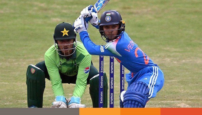 এর আগে ব্যাট করতে নেমে ভারত ভালো শুরু পায়। ওপেনার অ্যারন জর্জ ও বৈভব সূর্যবংশী ৪৭ রানের জুটি গড়েন। যদিও একটা সময় ভারতের স্কোর ছিল ১০৯/৪। তবে ত্রিবেদী ইনিংস আগলে রেখে ৯৮ বলে ৬৮ রান করলে ভারতের সংগ্রহ ২০০ পেরিয়ে নেন। অমব্রিশ ৩৮ বলে ২৯ রান করে আলি রাজা’র বলে আউট হন। এরপর চৌহান ও খিলান প্যাটেল ৫০ রানের জুটি গড়ে ভারতকে ২৫০ পার করান।